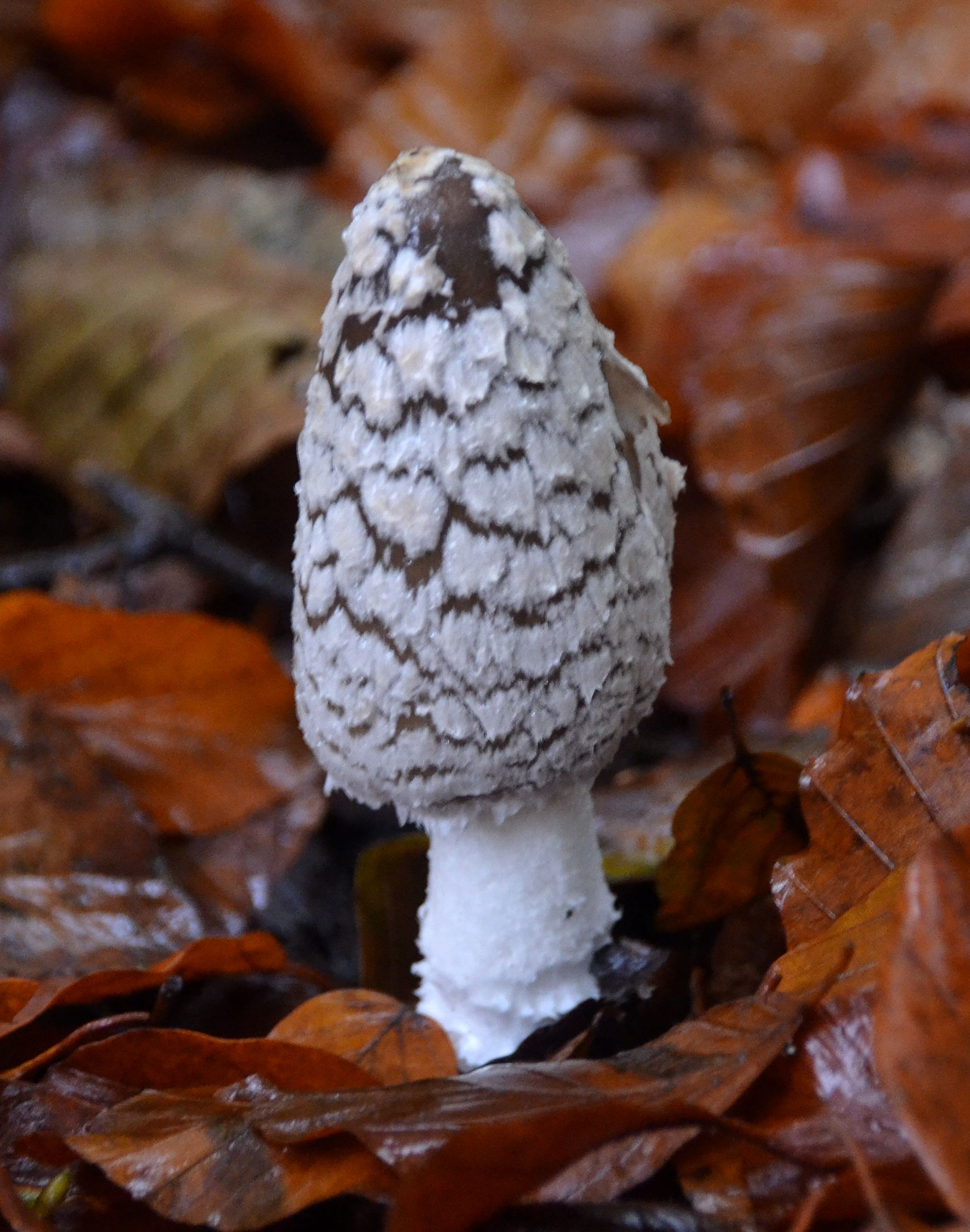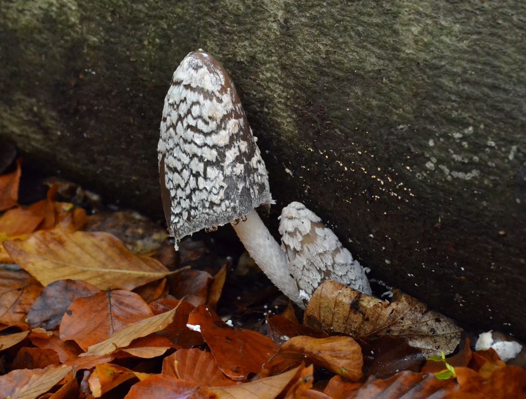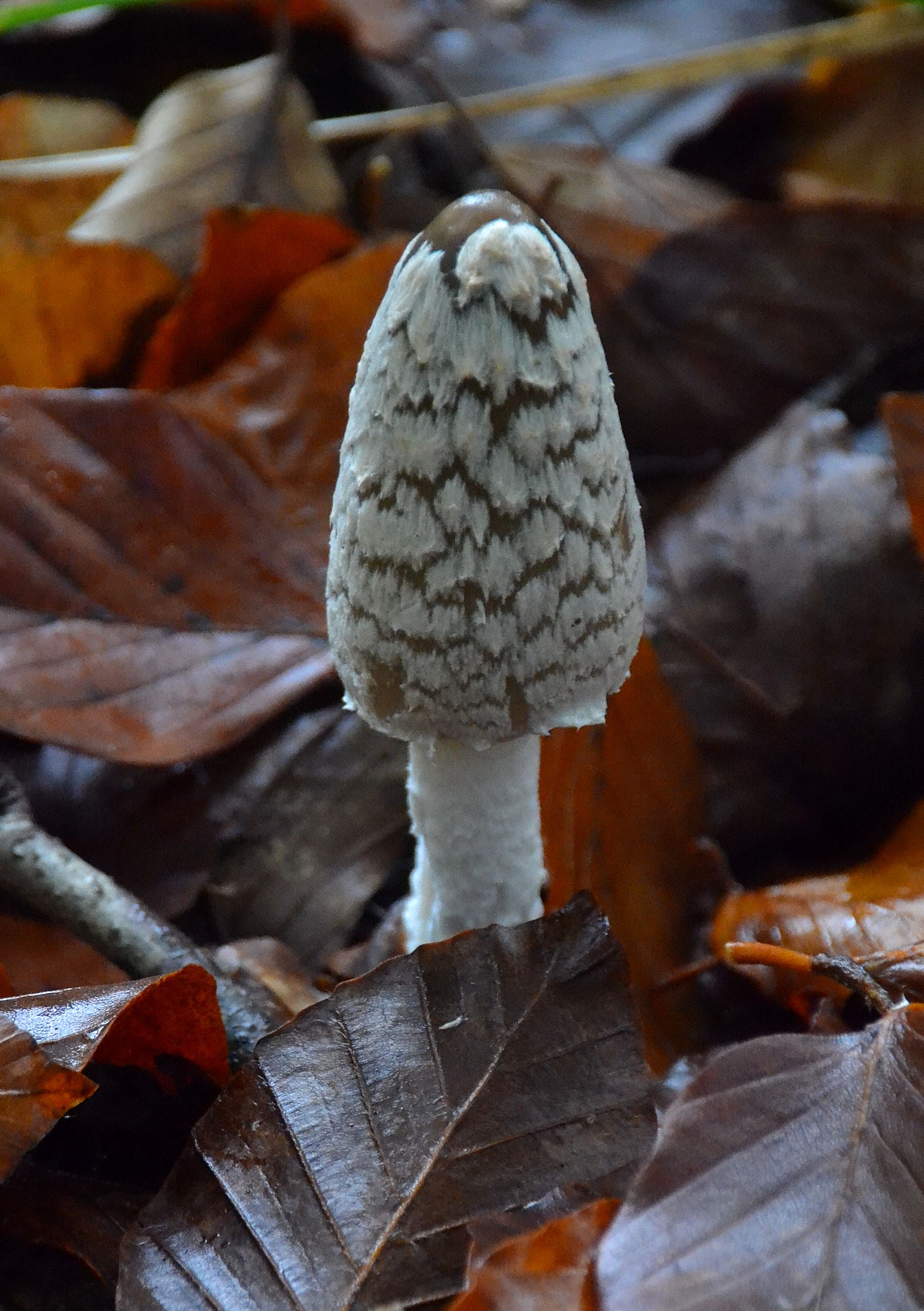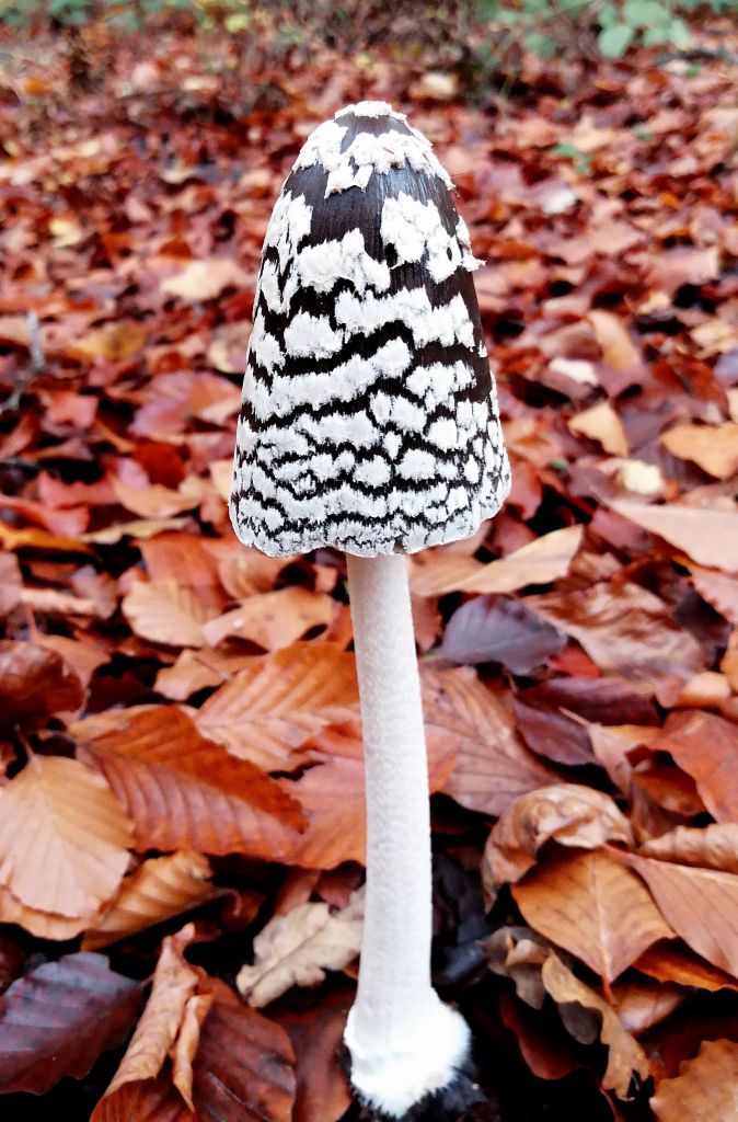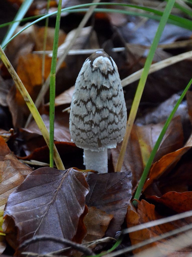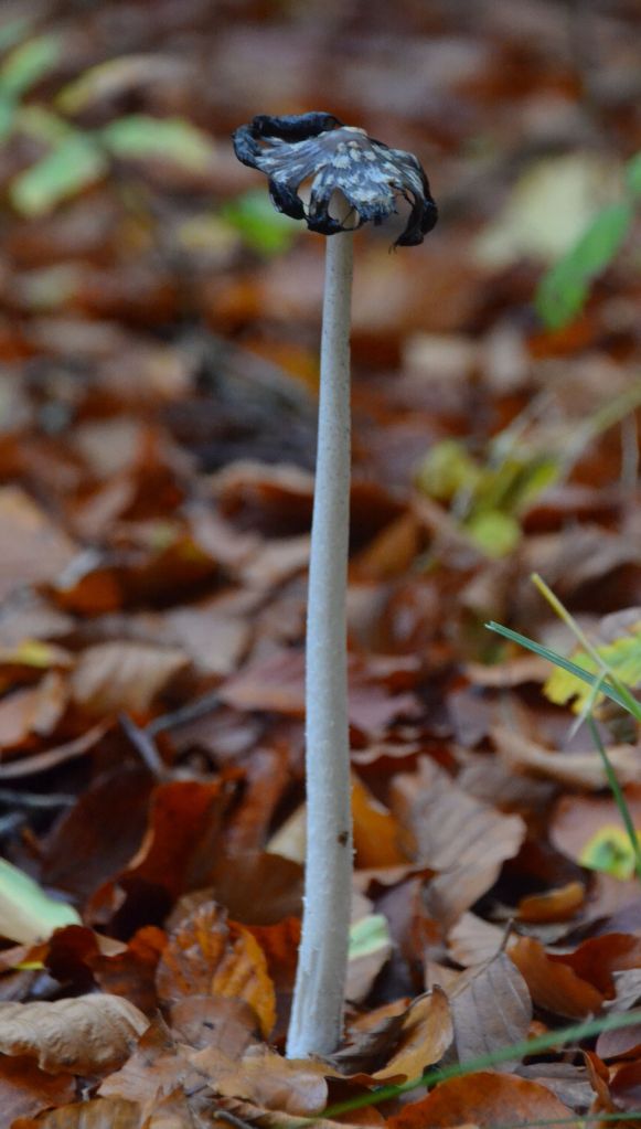 Reading up on things when I got home, I learned the poisonous Magpie Inkcap fruit bodies evolve through a sequence of shapes – egg to gherkin, then opening up to bell-like – through their short lived emergence. The patterning of white or silvery grey breaks into separate patches to reveal the glossy dark brown background as the reproductive cycle of spore dispersal progresses. The stalk is white, hollow and not very stable, slightly tapered towards the top and covered with scales. Eventually, at around day four by my observations the brim of the cap rolls up and dissolves, then the cycle is complete and the stalks collapse.