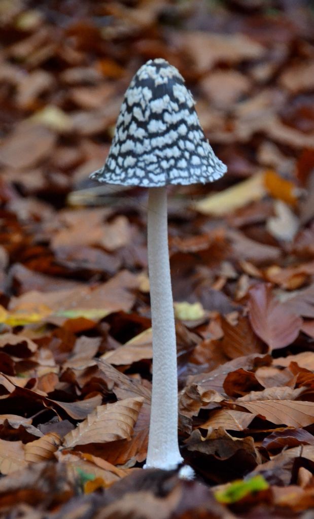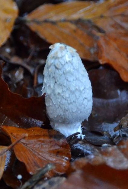 This began when choosing somewhere to go on Sunday (25th), a sunny first day of the detested dark season, I opted for a location near Nettlebed where Firecrests (the bird) might be found. After wandering around for a bit I met an enthusiast who was photographing something in the leaf litter with quite sophisticated paraphernalia. Guessing that must be fungi I engaged with him and he pointed out first some red Sickener mushrooms and then Magpie Inkcap (pictured below) growing from beneath a fallen log.