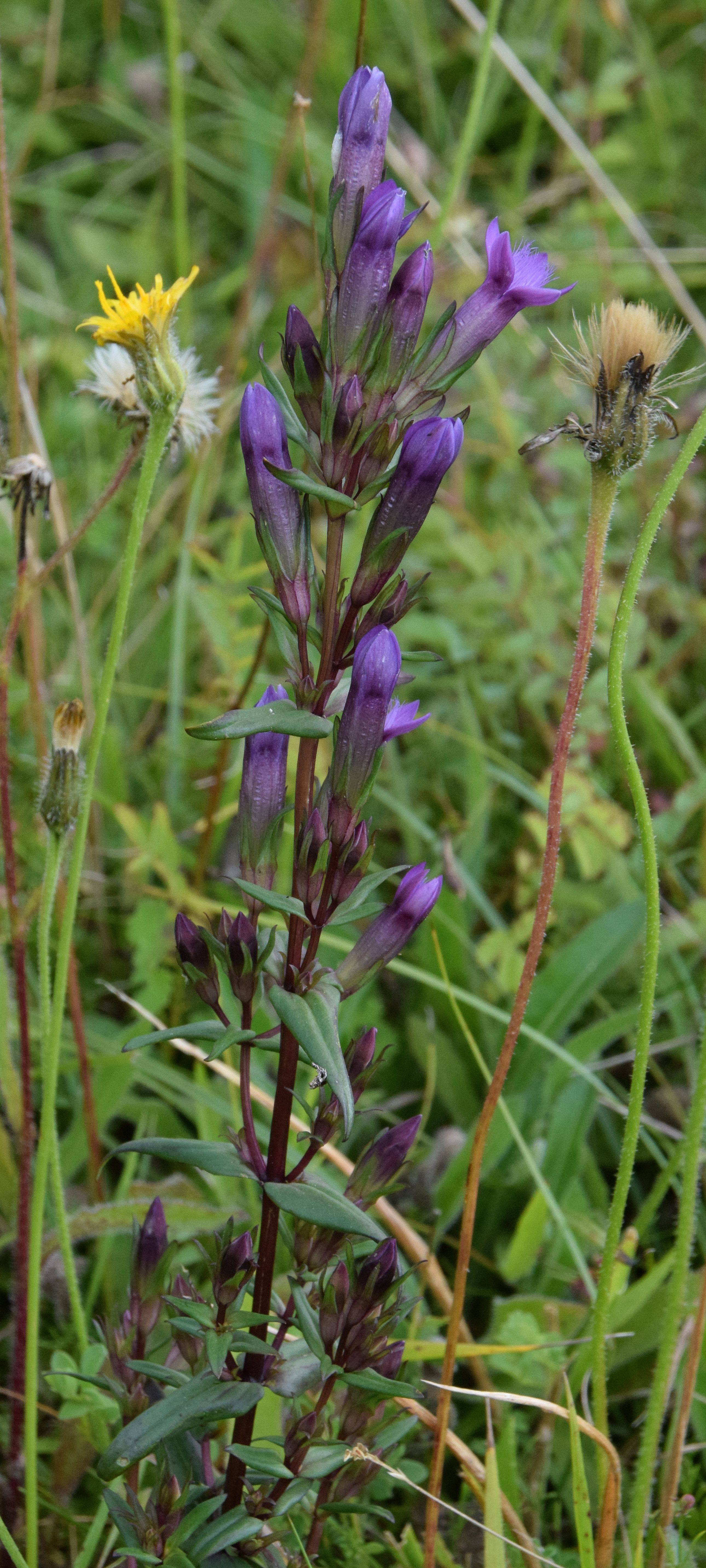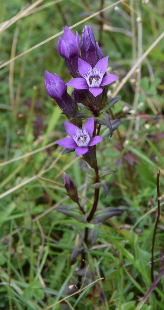 On the second visit my attention was caught by numbers of Gentian at the western end of the south-facing hillside here. My Seek app ID’d these variously as Field and Autumn Gentian, then failed to distinguish some scarce and much sought Chiltern Gentian further east along the slope. On reading things up I learned the paler Field Gentian is unlikely either this far south or in the habitat, and in any case has four petals per flower to the other two’s five. Erring on the side of caution I at first assumed all the plants I had seen were the commoner Autumn species, thinking the differences between it and Chiltern (see here) were subtler than they actually are.