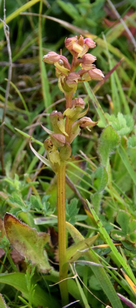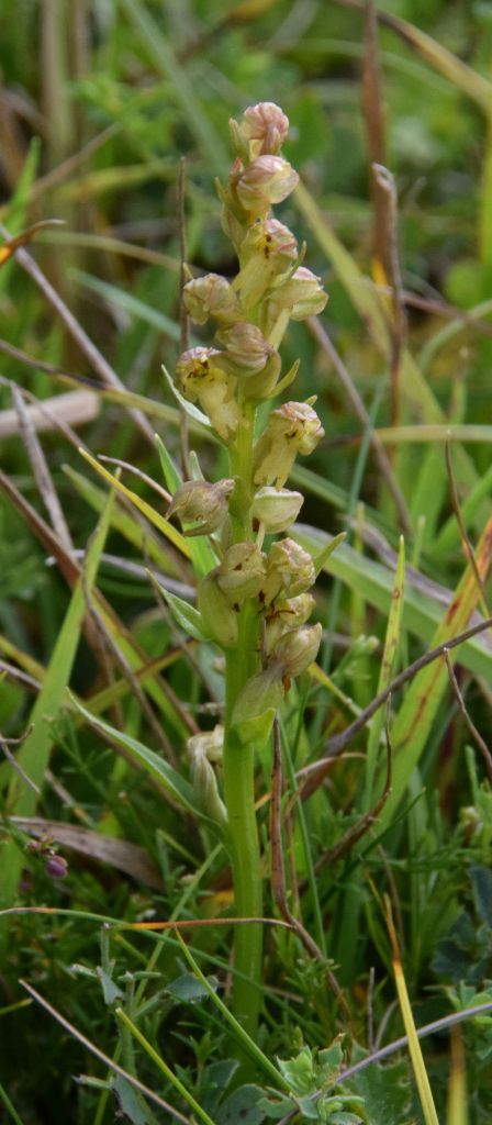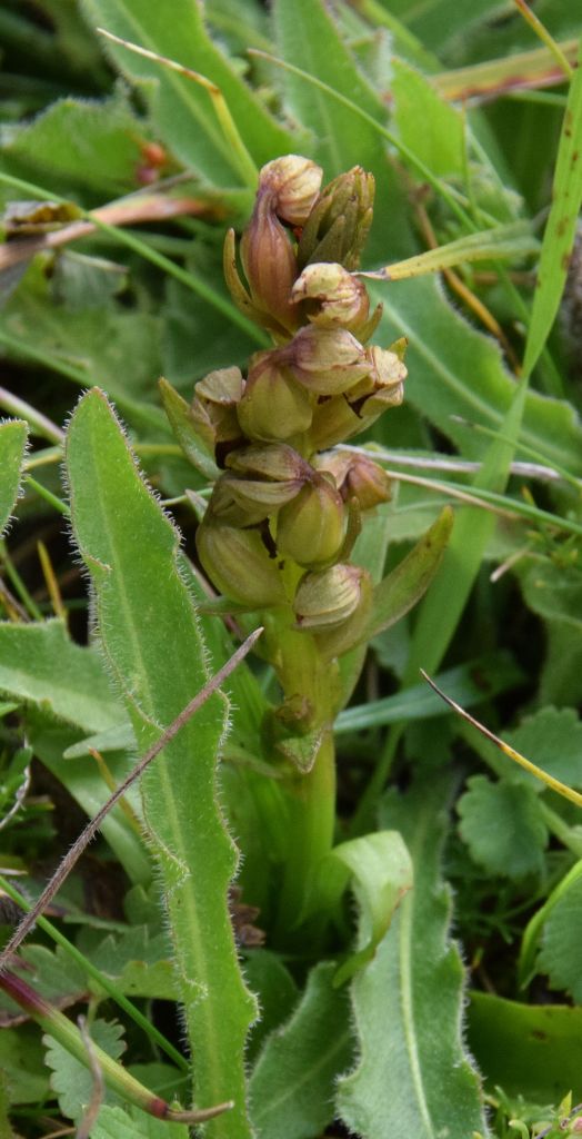 All were indeed small but I nonetheless felt I should have picked out some of the better ones on those earlier visits, even allowing for my companion’s prowess. The tone of the 5 – 25 flowers on stems up to 20 cm (in other places), varies from yellowish-green through pink to reddish brown, and these are said to suggest the hind legs of a frog. Sources I have consulted agree that a resemblance to those amphibians is a stretch of the imagination, but the left hand image (above) is possibly the most frog-like overall of those observed today. Here (below) are a few more.