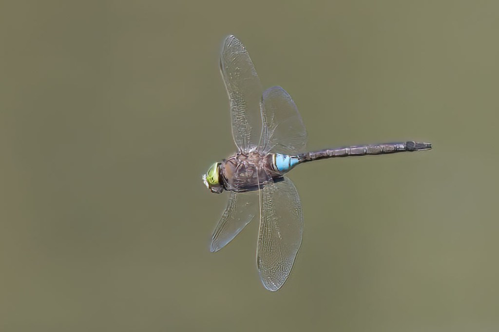 This dragonfly is a bit smaller and rather more nondescript than the familiar, iridescent blue and bright green Emperor (Anax imperator) of any English summer. In males the waisted abdomen is dull brown with a black line running up the centre and a distinctive, pale blue saddle near the top; as our county recorder’s flight study from Radley (below) shows. The thorax is a greener-toned brown, and the eyes green. Lesser was first recorded nationally in 1996, with breeding first proven in Cornwall three years later. Since then sightings have become progressively more frequent as far north as Orkney, and further scattered breeding sites have been identified.