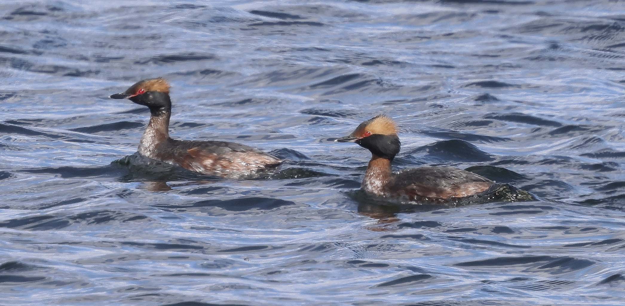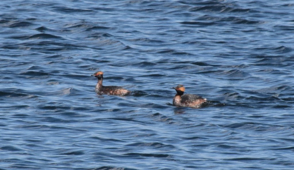 These birds were noticeably fast swimmers, and at intervals would take flight from speedily approaching wind surfers and relocate even further away. But for a second time they did move closer inshore, though never near enough for the quality of pictures I or others were seeking. We managed to persuade passing less-experienced bird watchers and general public agreeably to keep back from the wave wall, but still the wary Slavs would only get so close before drifting quickly away again.